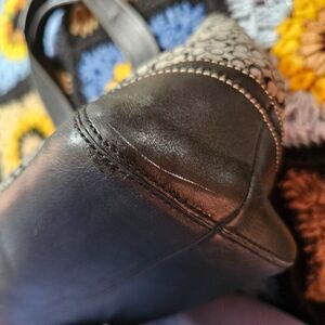 Coach soho pleated black and gray signature C print satchel shoulder bag with pocket on the exterior, zipper pocket on the interior with two smaller pockets on the opposite side, zip top, buckle strap detail, and side snaps to make the purse smaller or larger.