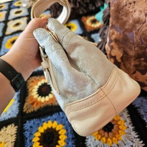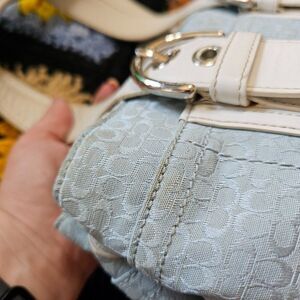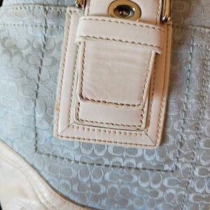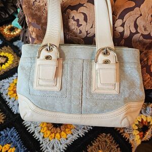 Coach soho pleated white and blue signature C print satchel shoulder bag with pocket on the exterior, zipper pocket on the interior with two smaller pockets on the opposite side, zip top, buckle strap detail, and side snaps to make the purse smaller or larger.