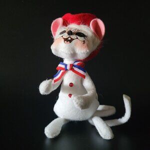 A collectible Annalee felt mouse featuring patriotic red, white, and blue details. Designed for display or as a festive decor piece.