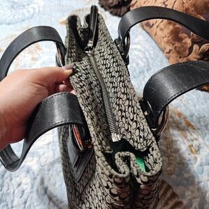 Coach soho pleated black and gray signature C print satchel shoulder bag with pocket on the exterior, zipper pocket on the interior with two smaller pockets on the opposite side, zip top, buckle strap detail, and side snaps to make the purse smaller or larger.