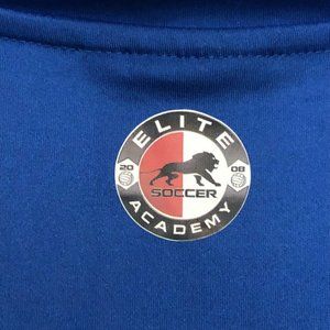 Blue Elite Soccer Academy Squadra Soccer shirt. Dated 2008 with a lion crest and American Flag on right sleeve.