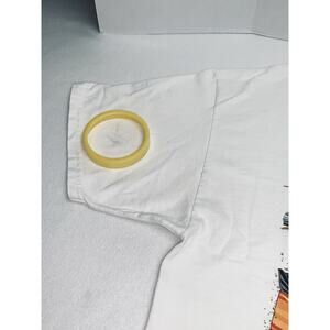 As you can see from the pictures of what you will receive, this shirt was worn and has a few marks/stains. None are major or take away from the bright graphics and information. This is a hard to find shirt with lots going on.