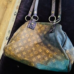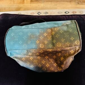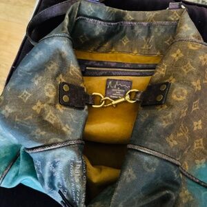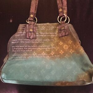 “Heartbreak Jokes” Tote. Coated Louis Vuitton canvas with hues of purple blue and green…any collector’s quintessential! Exterior in pristine condition with interior showing light wear.