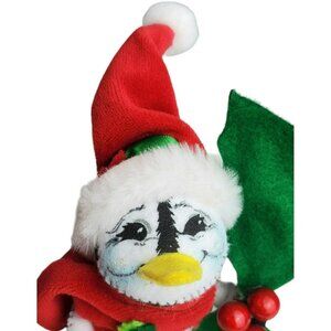 This charming Annalee Christmas penguin is the perfect addition to your holiday decor. Dressed in a festive red scarf and Santa hat, this North Pole Penguin is ready to spread some Christmas cheer. The black feathers add a touch of whimsy to this collectible artist doll. Crafted from high-quality fabric and features holly leaves to complete the seasonal look. This original Annalee creation was released in 2009.