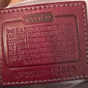 The serial number G0969-13885 identifies the Coach 2009 Clover Satchel, also known as the Pearlized Leather Bag, in the color dark red. Since this is a vintage bag, it is no longer sold by Coach