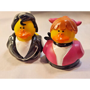 The product is a pair of Elvis and Peggy Sue CelebriDucks rubber ducks, celebrating the iconic rock & roll artist Elvis Presley. The Elvis duck is a 2009 limited edition and makes a great pair with Peggy Sue. These original figurines are a unique and playful way to commemorate the King of Rock and Roll's legacy in the music industry. Made in China, these rubber ducks showcase the characteristically exaggerated and artistic style that is synonymous with Elvis Presley's fame. Perfect for collectors of music memorabilia or fans of the rock & pop genre, these ducks are a fun and creative addition to any Elvis Presley memorabilia collection. Please look at all the photos as they are part of the description. Please email with any questions.