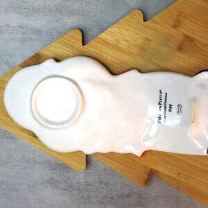 Add this shiny ceramic 2009 Fitz and Floyd Sugar Coated Collection Christmas Snowman spoon rest to your holiday decor collection.