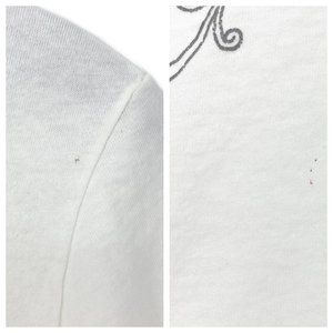 Pre-owned, Good condition with tiny hole on the front near hem of right sleeve, age spots due to older tee and small mark (See last photo) | Measurements: Shoulders 16", Pit/Pit 17", Bust 34", Sleeves 8", Arm width (Bicep) 8", Sleeve opening 6.5", Length 26"