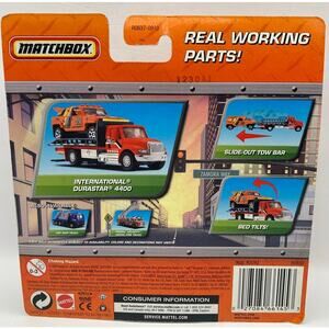 Get ready to add this fantastic 2009 Matchbox Real Working International Durastar Tow Truck 4400 diecast to your collection! This new-in-package (NIP) tow truck is a must-have for Matchbox enthusiasts and collectors alike. With its realistic design and intricate details, it's sure to impress.