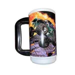 This is a Monster Jam cup with a handle, likely a souvenir or collectible item featuring the popular monster truck Grave Digger.