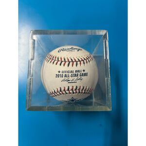 Official 2010 MLB All-Star Game baseball in protective clear display case. Authentic game ball with All-Star logos and official MLB markings. Perfect for collectors, baseball fans, or sports memorabilia enthusiasts.