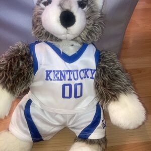 This Build-A-Bear Workshop plush bear is a must-have for any wildlife fan. The 16in. grey wolf is dressed in a University of Kentucky Wildcats fan outfit complete with a jersey and sports shorts. The bear is made of soft plush material and is in excellent condition.