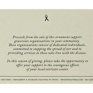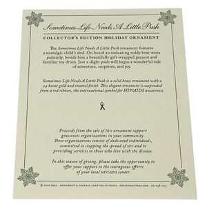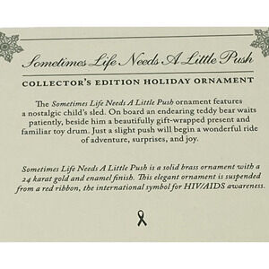 * "Sometimes Life Needs A Little Push" is a solid brass ornament with a 24-karat gold and enamel finish. This elegant ornament is suspended from a red ribbon, the international symbol for HIV/AIDS awareness.