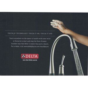 Original 2010 Delta Faucet print ad featuring a unique wrist turn mechanism. Ideal for collectors or those interested in vintage plumbing ads. Perfect for framing or display in a bathroom or plumbing-themed room.