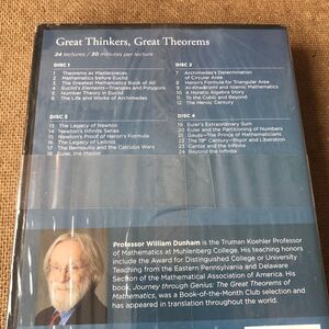 2010 sealed set of The Great Courses 4-Disc DVD and Course Guidebook entitled “Great Thinkers, Great Theorems”. Includes 24 Lectures/30 minutes per lecture. Taught by Professor William Dunham from Muhlenberg College, Pennsylvania.