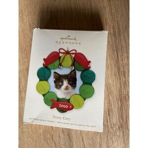 This is a 2010 Hallmark Keepsake Christmas Ornament in the shape of a circle with a multicolor design featuring a cute cat. The ornament is made of mixed materials . It measures 3 inches in length and 1 inch in width, and weighs 5 oz. The ornament is an original and part of the Hallmark Keepsake Ornament collection. It is a medium-sized, hanging ornament that can be used as a photo frame for a 2" x 1.75" photo. The ornament is perfect for Christmas and can be given as a gift.