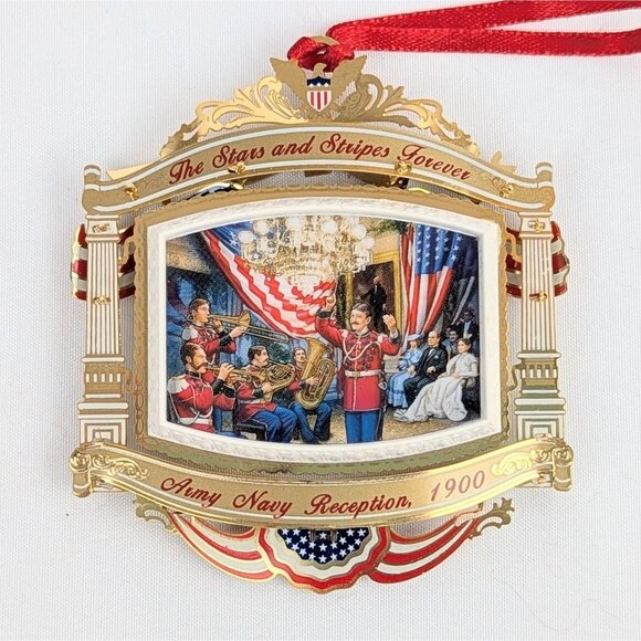 This 2010 Official McKinley White House Christmas Ornament was issued by the White House Historical Association and celebrates the important role of music in the White House. The design honors President William McKinley, who served from 1897 to 1901, and highlights the longstanding presence of the United States Marine Band at official White House events.