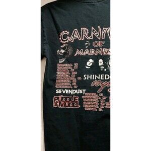 2010 Carnival of Madness Game Over Tour T-Shirt in excellent pre-loved condition. There is a very tiny hole under the right arm which is pictured, barely noticeable and does not affect this cool shirt at all. Measurements included in description :)