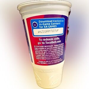 Taco Bell promotional cup with vibrant design. Features bold text and colorful graphics.
