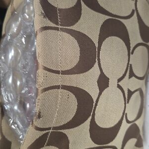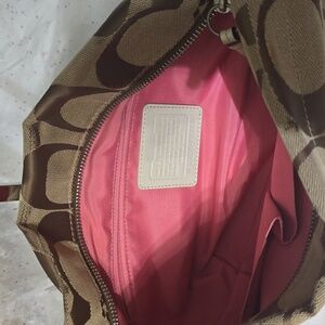 Stylish Coach shoulder bag with iconic pattern. Beige and brown tones. Perfect for everyday use.