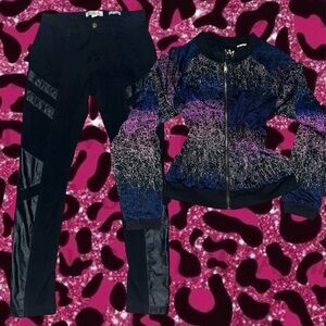 2010s Nicki Minaj black jeggings with back pockets size large (11/12) mid rise has lint from wear and wash & black and purple cropped tracksuit bomber jacket size large barley worn #2010s #goth #grunge #NickiMinaj