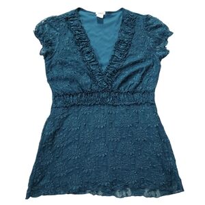2010s Studio Y Blue Lace Deep V Top Sz Medium. Rusched under the bust and around the neckline. fully lined except the cap sleeves. Good used condition, don't see any holes or stains