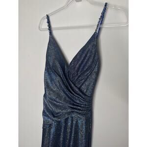 Stunning 2010s Terani Couture evening gown in a royal blue and silver metallic shimmer finish. New with tags. Features a deep V-neckline, ruched waist detail, beaded straps, and a dramatic low back with gathered ruching. Full-length mermaid silhouette with beautiful drape and elegant sparkle. Fully lined, 100% polyester. Size 2. New, unworn, and ready for any formal, gala, prom, or special event.