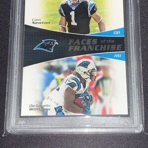 Own a piece of Carolina Panthers history with this graded 2011 Topps Faces of the Franchise card featuring star quarterback Cam Newton and running back De·Angelo Williams. This card captures a pivotal era for the Carolina Panthers, showcasing two dynamic players who defined the team's offense. The vibrant imagery and clear depiction of these iconic players make this a must-have for any serious football collector.