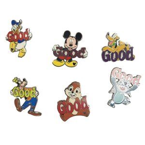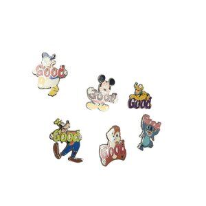 Each pin in this Hidden Mickey set of six features beloved Disney characters paired with the vibrant word "Good," offering a charming and cheerful collectible. These Limited Release pins were originally released on January 1st, 2010 in Walt Disney World except the Stitch Hidden Mickey Completer pin received in a blind bag able to be purchased after spending $30 at any pin store.