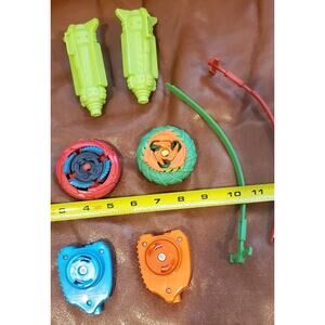 2011 Hasbro Tomy Beyblades Red Blue Green Orange Spinning Toys Collectibles in played with condition. There are areas of discoloration, missing paint, and surface scratches. See photos for details.
