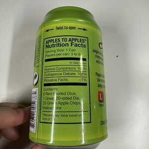 Get ready to have a blast with this 2011 Mattel Apples to Apples Dice Game in a Can. This complete game is perfect for 3 or more players and features a fun and strategic gameplay that's suitable for players aged 8 and up. With its unique dice design, the game offers an exciting twist to the popular Apples to Apples game title.
