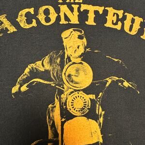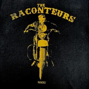 Original The Raconteurs band tee featuring skull motorcycle rider graphic in vintage-style yellow print.