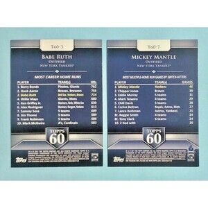 This 2011 Topps New York Yankees commemorative sports trading cards features two of the baseball legends, Babe Ruth and Mickey Mantle. The cards are part of the 60th-anniversary celebration of the team. They are licensed Commemorative issues, and card number is #T60-3 for Babe Ruth and #T60-7 for Mickey Mantle.