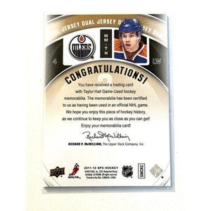 2011-12 SPx TAYLOR HALL Winning Materials 2 Colors DUAL 2 Game Jersey ~ OILERS