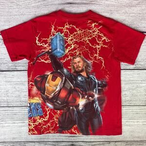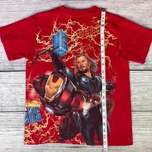 2012 Avengers Marvel Hulk, Flash, & Friends All Over Print T-shirt in 9/10 condition, small pin hole shown near the back collar (see pics). Youth size medium, measurements are shown in pics. Always willing to do lower pricing on bundle deals.