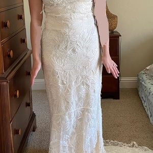 2012 Claire Pettinbone “Sky Between The Branches” in Very Good condition. Still has the tags, size 10 will fit best on a size 8. There is minimal wear and tear on the dress, was originally a stock dress. Any wear and tear can be easily fixed by a seamstress during alterations. The dress has never been altered as well. Very beautiful, I’m selling it because I didn’t feel a connection when I tried it on.