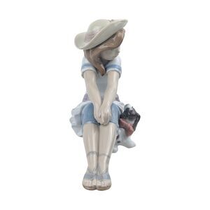 This is the beautiful Lladró Annual Piece for 2012, titled "A Tender Moment." This handcrafted Spanish porcelain figurine captures a heartwarming scene of a young girl in a sun hat sharing a quiet moment with her adorable little puppy. The piece features the classic soft pastel coloration and glossy finish that Lladró is known for.