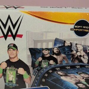 The 2012 WWE World Wrestling John Cena Full Sheet Set includes a flat sheet, fitted sheet, and one pillowcase, all featuring a design with the wrestler John Cena. The bedding is in a full size, with a colorful multi-color design that appeals to both male and female wrestling fans. Perfect for any wrestling enthusiast looking to add a touch of their favorite WWE superstar to their bedroom decor.