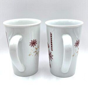 2013 Holiday STARBUCKS Set of 2 Snowflake Christmas Coffee Red Gold Mug 12 oz.