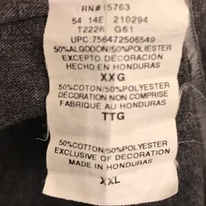 Shirt has been gently worn and may have some minor stains, hard wrinkles, or threading on it. Shirt color is a darker gray color, almost charcoal gray.