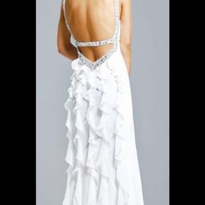 Showstopper! This Faviana dress was purchased from Bloomingdales, altered from a 12 to about a 10 (bought 12 for bust area) for my daughter's Prom. Amazing sequin detailing and waterfall ruffles down the back. Would be GORGEOUS as a wedding dress.
