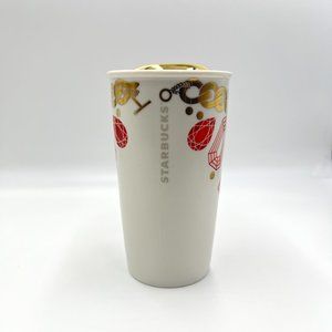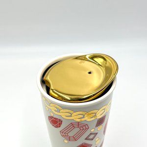 2014 Starbucks Holiday Dot Collection Ceramic Tumbler With Red Ruby Jewels / Gems Gold Chain Pattern & Gold Lid. Preowned, in good condition, as pictured. No chips or cracks.