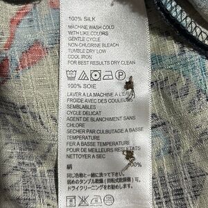 The 2014 Tommy Bahama Seasons Greetings Silk Shirt in size M is a tropical patterned button-up shirt perfect for casual occasions. Made from lightweight and breathable silk fabric, it features a classic fit with a collared neckline and short sleeves.
