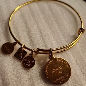 This exquisite Alex and Ani bracelet features a gold-tone adjustable wire design adorned with a striking pink charm. The bracelet's elegant sunburst pattern and brand medallions add a touch of sophistication, making it a standout accessory for any occasion.