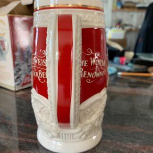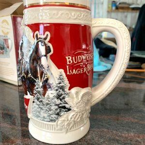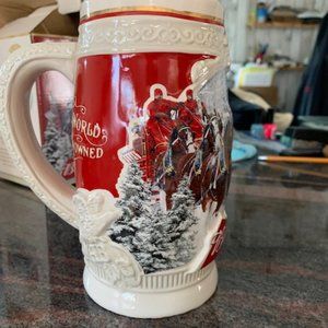 2015 Budweiser Holiday Stein with The World Renown Clydesdales. Comes in original box and includes Certificate of Authenticity. White spots/lines are glare from lights. Measures approx. 7"H & 3" opening. Excellent condition. *Color may vary slightly from pictures.