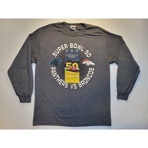 This is a 2016 Majestic Super Bowl 50 T-Shirt for men in size L featuring graphic prints of the Carolina Panthers and Denver Broncos logos, reminiscent of the Super Bowl event. The shirt has long sleeves, a crew neck, and comes in a gray color. This regular fit shirt is perfect for any sports enthusiast looking to showcase their team spirit. It is suitable for all seasons and would make a great addition to any fan's collection.