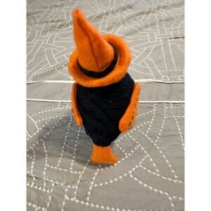 This charming Halloween penguin witch decoration features a plush design with an orange hat and bow tie. An adorable addition to any festive decor.
