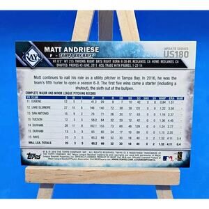 The product is a 2016 Topps Update Series trading card featuring Matt Andriese of the Tampa Bay Rays. This sports trading card is part of the base set for the 2016 season of Major League Baseball (MLB). Manufactured by Topps, this card is a parallel/variety [Base] and has the card number US180. Perfect for collectors and fans of baseball memorabilia, this card offers a glimpse into the career of a specific player during the 2016 season.