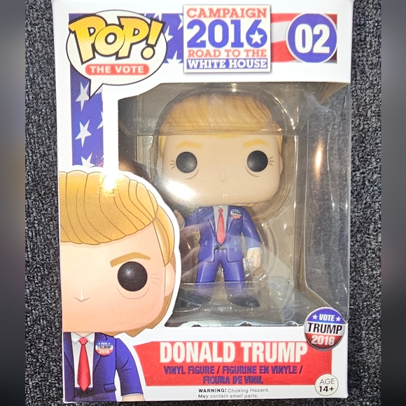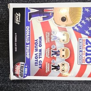 This 2016 Funko Pop The Vote #02 vinyl figure features Donald Trump, the former President of the United States, in his campaign for the Whitehouse. The figure is a standard size and made of high-quality vinyl material, with a unique design and packaging for collectors. The model is part of the Pop! product line and the The Vote collection, with features that make it a sought-after item among collectors and fans of public figures. The Funko Pop The Vote #02 Donald Trump figure is a perfect addition to any collection of collectible figures and bobbleheads. It is a vintage item from the 2016 release year, with a customized design and number in pack of one. The figure is in its original, unopened packaging, making it an excellent gift for any collector or fan of the former President.