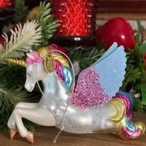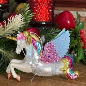A vibrant unicorn ornament featuring glittery wings. The unicorn has a golden horn and a mix of pink, blue, and rainbow colors.